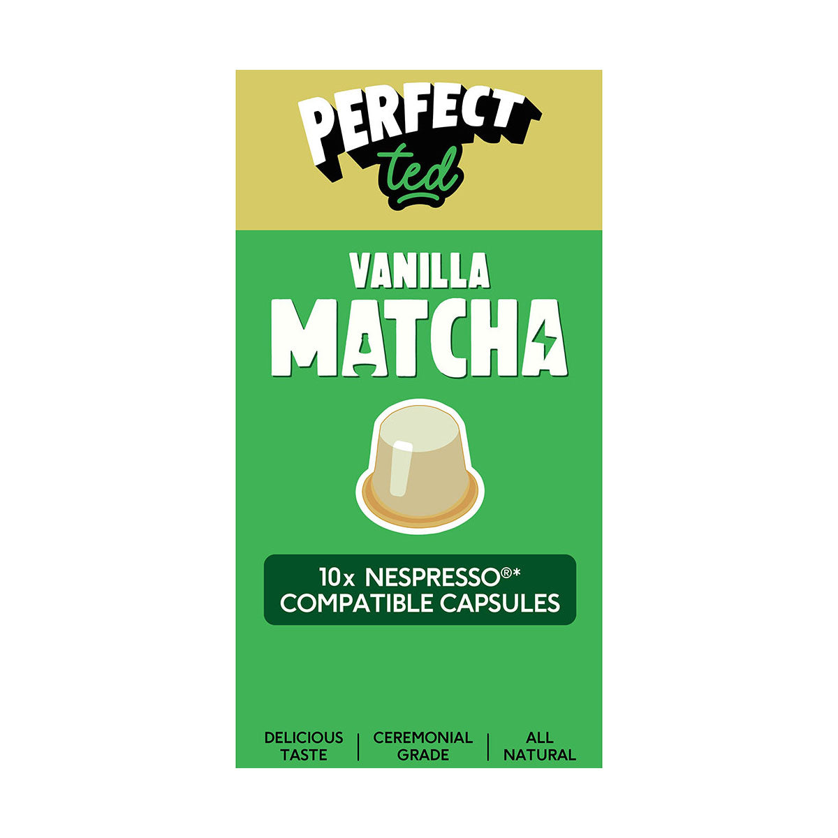 PerfectTed matcha is produced from young tea leaves that are grown in shade hand picked and stone ground to retain natural colour texture and flavour. The vanilla flavour blends smoothly without overwhelming the matcha offering a gentle but distinct aroma and taste. Every capsule delivers freshness and smooth finish.